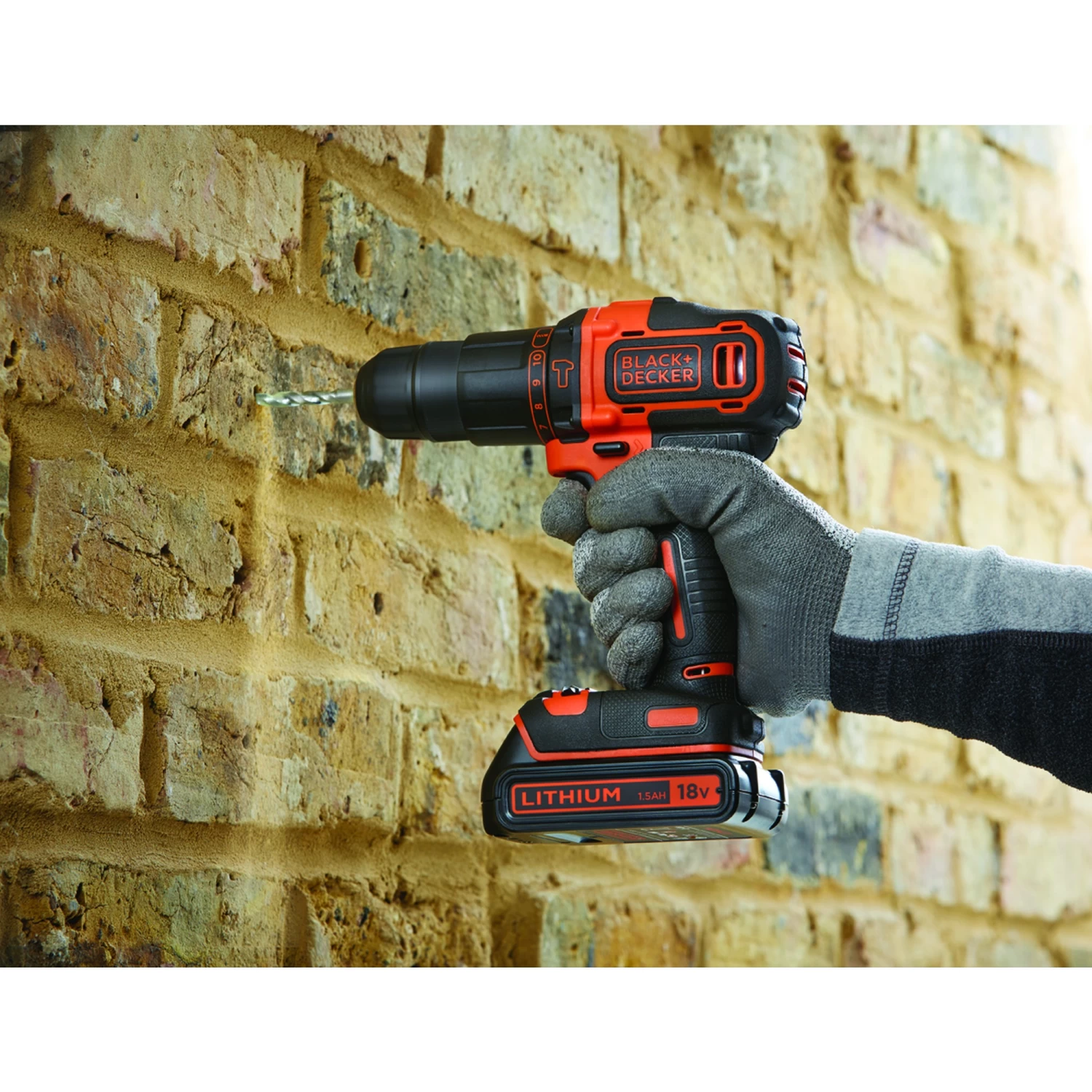 De BLACK+DECKER accu klopboormachine BDCHD18K-QW is een krachtige 18V Lithium-Ion machine (40Nm) met een zuinige 1,5Ah accu die een lange werktijd garandeert. Door de 10 koppelinstellingen en de 2 snelheden ( 0-400 / 0-1350 t.p.m.) is de machine zeer nauwkeurig af te stellen en bruikbaar voor bijna iedere schroef- en boorklus. Snelheid 1 is te gebruiken voor schroeven, snelheid 2 gebruik je voor boren. Door de klopfunctie (21.000 slagen per minuut) is de accu klopboormachine BDCHD18K-QW zelfs geschikt voor boren in muren. Hier heb je dus geen aparte gesnoerde klopboormachine meer voor nodig. De boor is voorzien van een LED werklamp en wordt geleverd in een koffer. Deze machine maakt onderdeel uit van het 18V platform van BLACK+DECKER. Dit betekent dat de accu?s van alle BLACK+DECKER 18V Lithium-Ion (tuin)machines uitwisselbaar zijn. Daarom worden er nu ook machines zonder accu aangeboden zodat je voordelig een nieuw apparaat kunt aanschaffen als je al een machine met accu hebt.