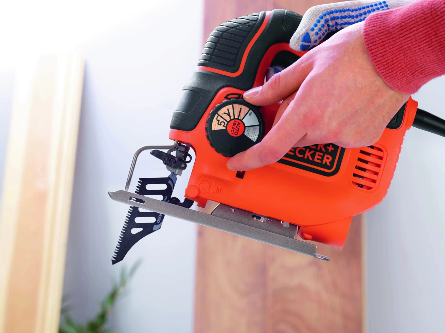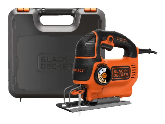 De compacte Black & Decker decoupeerzaag KS801SEK-QS 550 watt is een compacte pendeldecoupeerzaag waarmee u heel precies hout, metaal, aluminium of pvc kunt doorzagen. De zaag is voorzien van de AutoSelect-technologie. U kiest zelf het pictogram en de machine stelt de juiste snelheid en pendelslag in voor een optimaal resultaat. Ook heeft de zaag een variabele snelheid voor optimale controle over uw zaagklus. De geïntegreerde stofafzuiging verzekert u van goed zicht op de zaagsnede. De motor met een vermogen van 550watt maakt deze zaag ook geschikt voor de wat zwaardere doe-het-zelfklussen in en om het huis. Wisselen van zaagblad gaat eenvoudig dankzij de sleutelvrije zaagbladwissel. De decoupeerzaag ks801sek-qs wordt geleverd in een handige koffer.