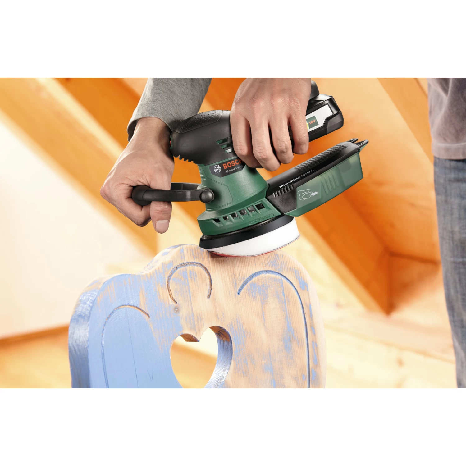 De accu-excenterschuurmachine AdvancedOrbit 18 van Bosch: netjes werken met weinig stof en maximale veelzijdigheid om elke klus moeiteloos te klaren. Uitstekend te hanteren, onder controle te houden en te bedienen voor probleemloos en zuiver werken in alle richtingen (horizontaal, verticaal, bovenhands). Kan worden gebruikt voor het schuren en polijsten van een groot aantal materialen, bijv. het schuren van hout waaronder deurkozijnen en meubels, of het polijsten van kunststof en gelakte oppervlakken zoals voertuigonderdelen. Kabelloze vrijheid voor alle klussen. Klithechtsysteem om schuurbladen snel en comfortabel te wisselen. Schuurpapier kan eenvoudig worden aangebracht dankzij de Paper Assistant. Bosch Electronic: traploze voorinstelling van het toerental, voor op het materiaal afgestemd werken.