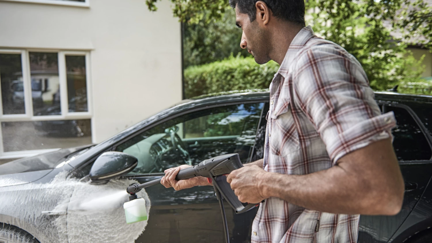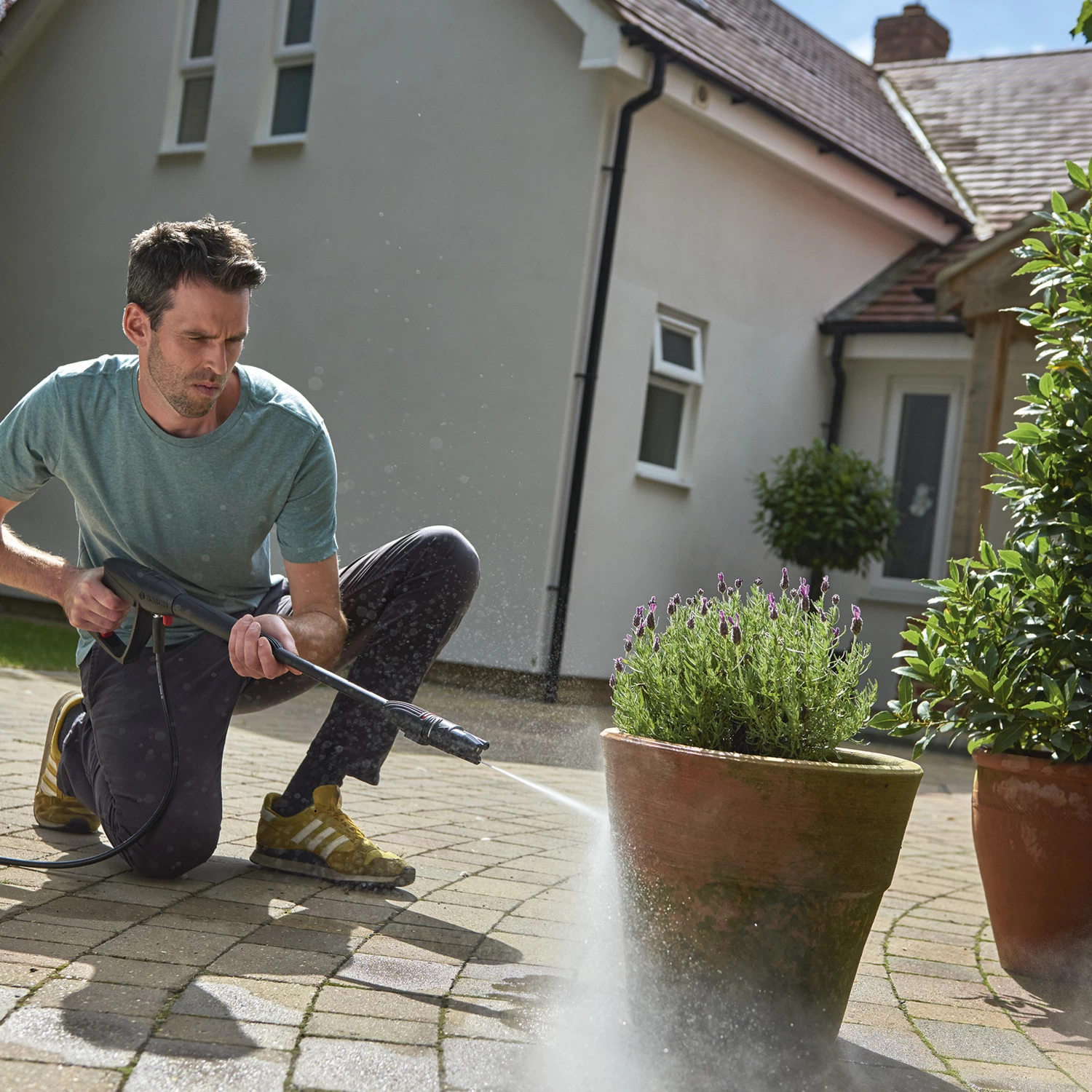 De sproeier kan gedraaid worden om te veranderen van de hogedrukstraal en vuilfrees naar de zeepoptie met lage druk. De hogedrukreiniger bevat een energie-efficiënt autostopsysteem dat enkel water pompt wanneer nodig.