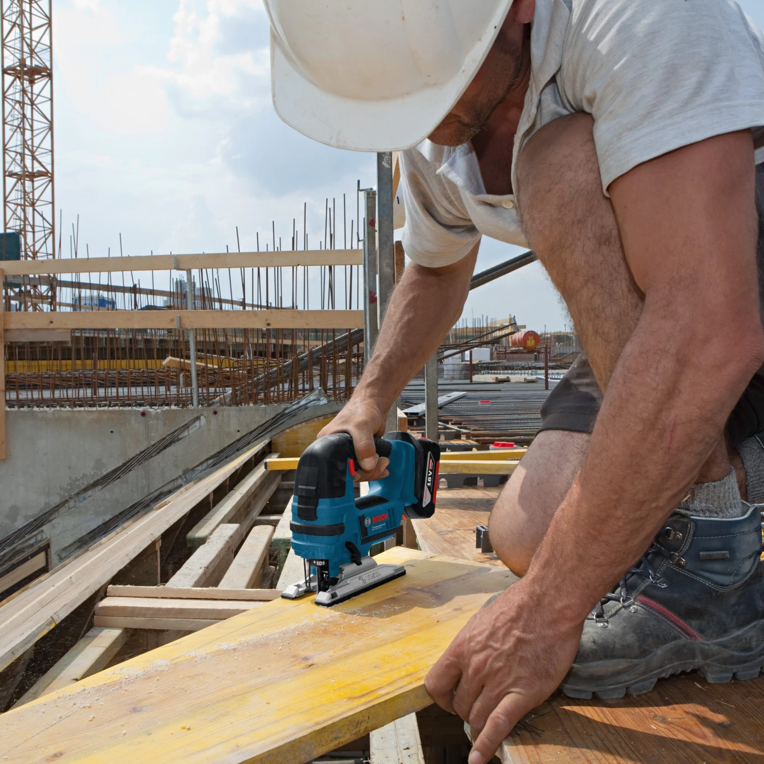 De Bosch Professional accu decoupeerzaag GST 18V-LI B is een sterke decoupeerzaag met beugelgreep. Dankzij de toerental schakelaar heb je veel controle over de machine. Door het gereedschaploze SDS systeem is het wisselen van het zaagblad snel en makkelijk. Met de Bosch Professional accu decoupeerzaag GST 18V-LI B kan je eenvoudig bochten en rechte lijnen zagen in massiefhout, spaanplaat of andere soorten hout. De machine maakt onderdeel uit van het Bosch Professional 18V accuplatform en wordt geleverd exclusief accu.