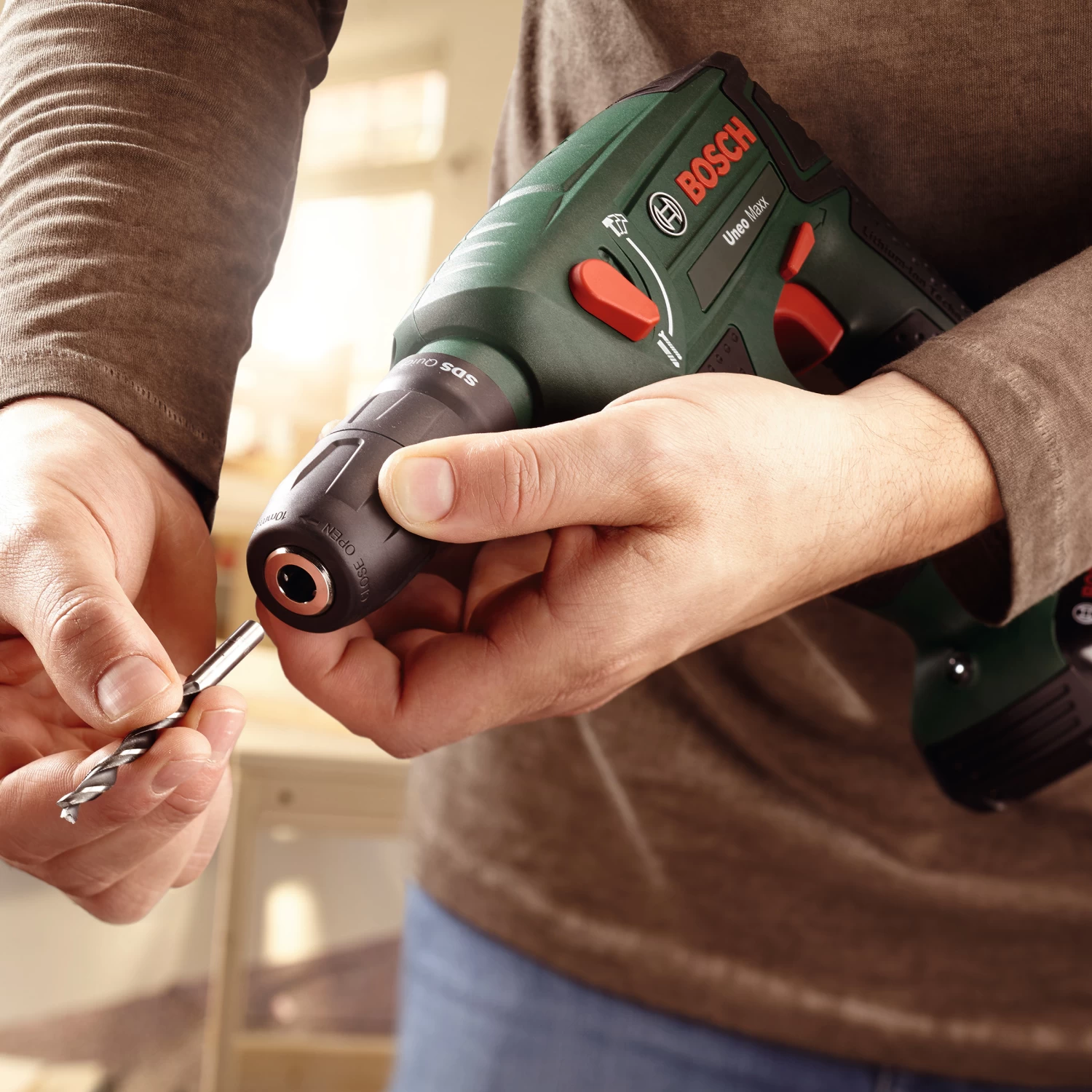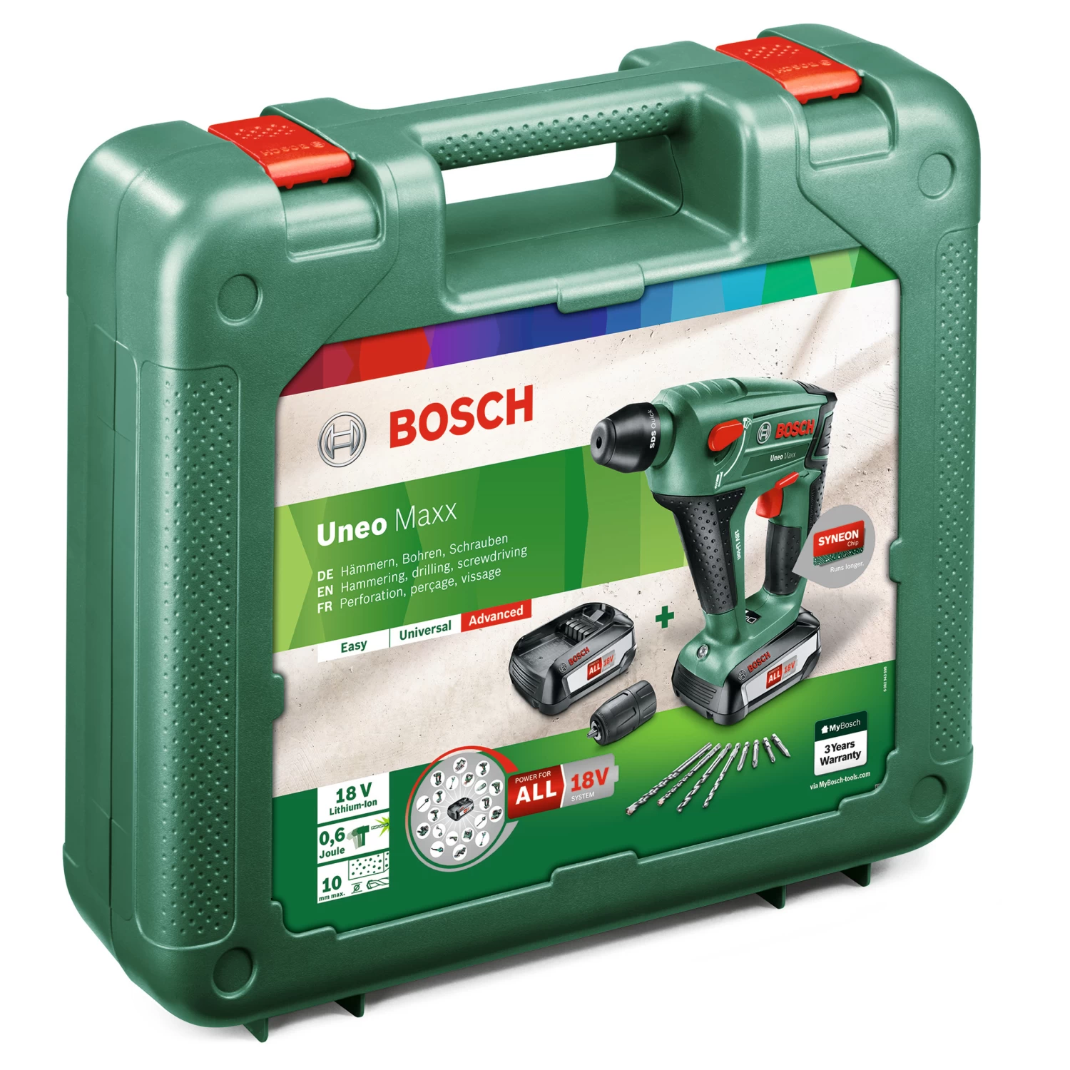 De Bosch Uneo Maxx accuboorhamer 18 volt is een accuschroevendraaier, boormachine en boorhamer in één compacte, krachtige en veelzijdige machine. Eenvoudig hameren, schroeven en boren in elke ondergrond: hout, gips, baksteen en zelfs beton. Dit is mogelijk door het innovatieve pneumatische slagmechanisme van de Uneo Maxx. De machine is voorzien van een krachtige lithium-Ion-accu en door de intelligente Bosch Syneon-chip levert de Uneo Maxx indrukwekkende kracht. De Bosch Uneo Maxx accuboorhamer 18 volt wordt geleverd met 2 accu’s. U kunt dus altijd doorgaan met uw klus.
