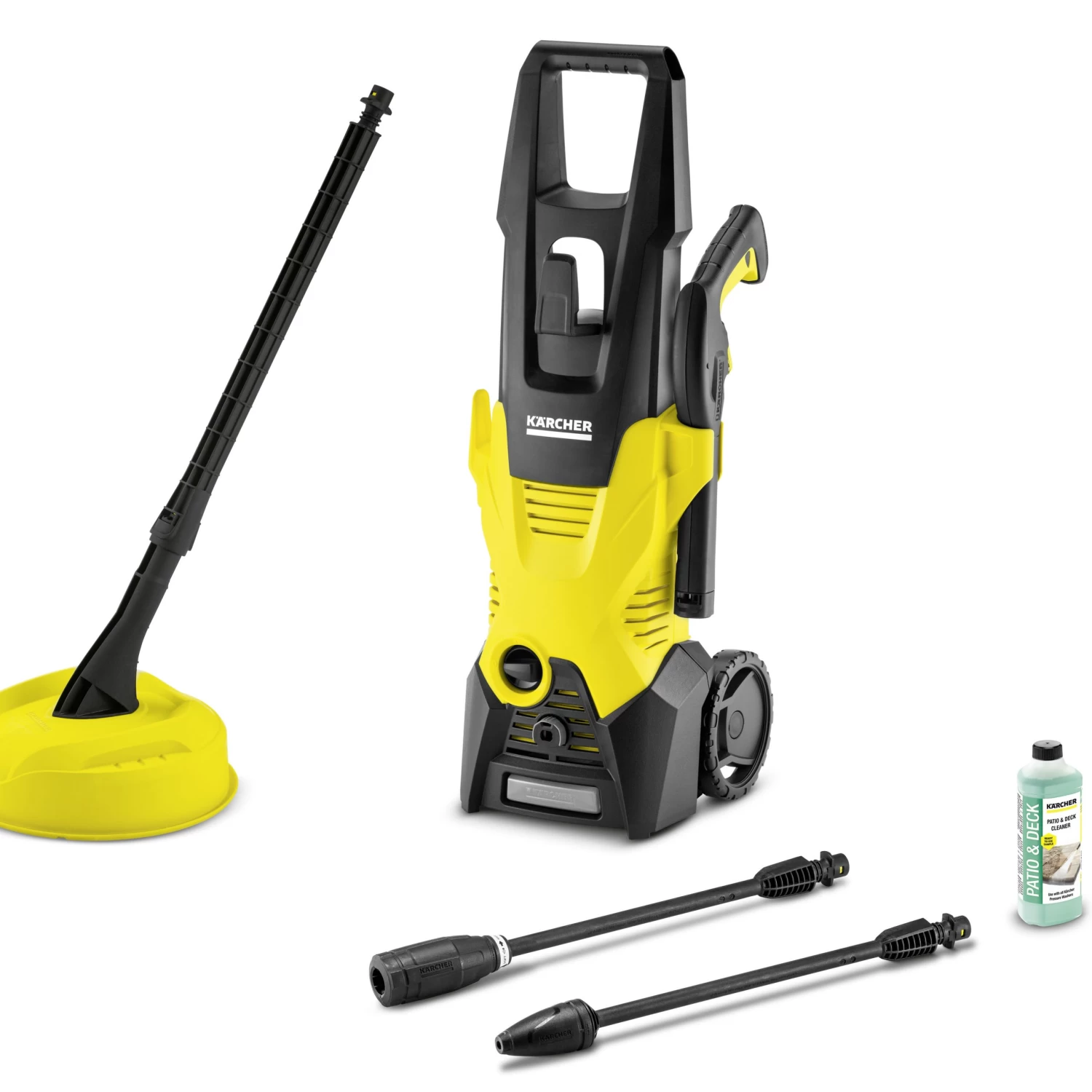 De Kärcher hogedrukreiniger K3 Home is te gebruiken voor het verwijderen van lichte vervuiling op bijvoorbeeld fietsen, tuinhekken en motoren. De hogedrukreiniger is uitgerust met een spuitpistool met handige Quick Connect-aansluiting, een 6 meter lange hogedrukslang en een waterfilter die de pomp beschermt tegen binnendringende vuildeeltjes. Daarnaast is de hogedrukreiniger uitgerust met een Vario Power spuitlans (VPS), waarbij je de druk met een simpele draai aan de lans kunt aanpassen, en een vuilfrees met een roterende puntstraal voor de meest hardnekkige vervuiling. Samen met de Home kit, met de T50 oppervlaktereiniger en het Patio & Deck reinigingsmiddel (500 milliliter), kunnen grote oppervlakken snel en spatvrij worden gereinigd.
