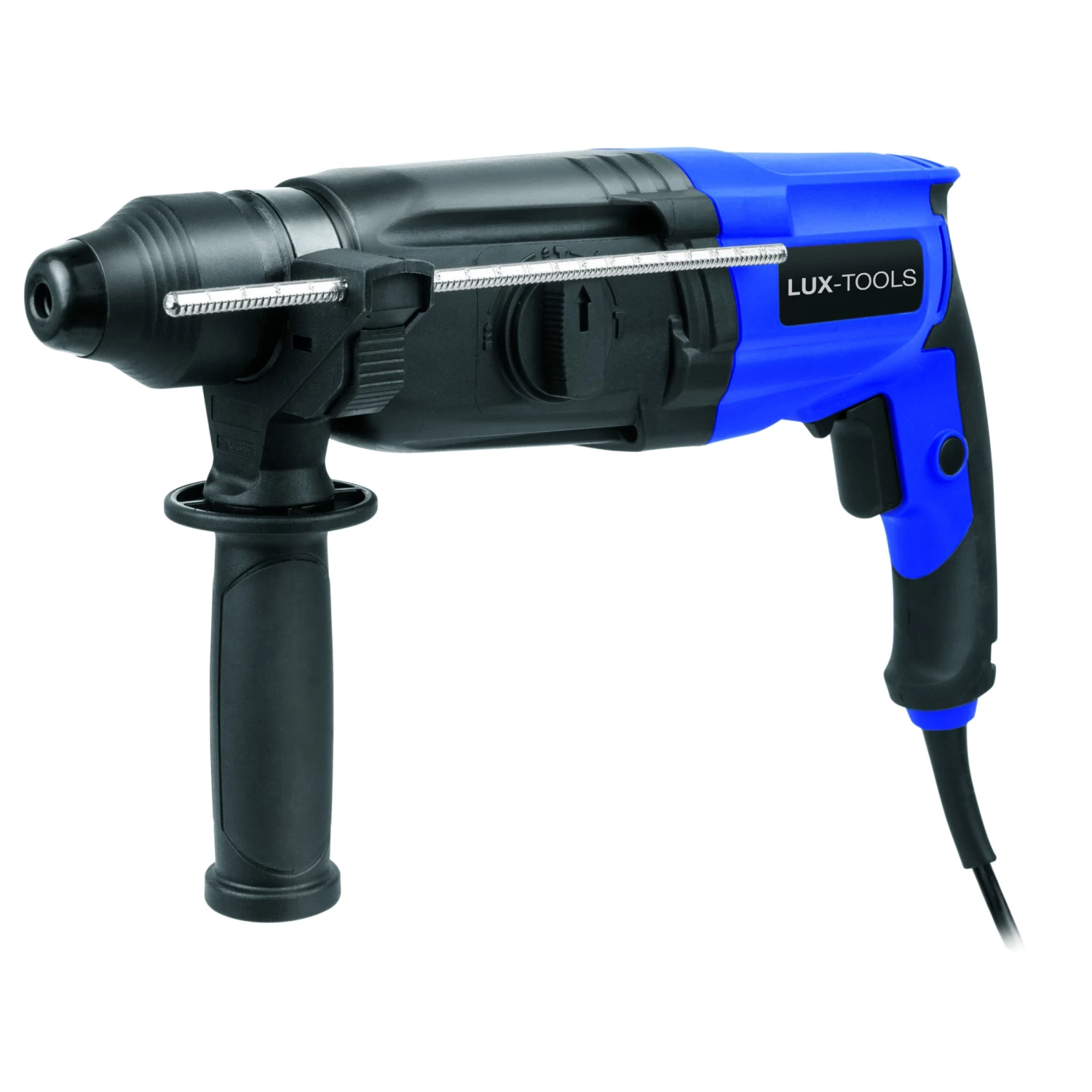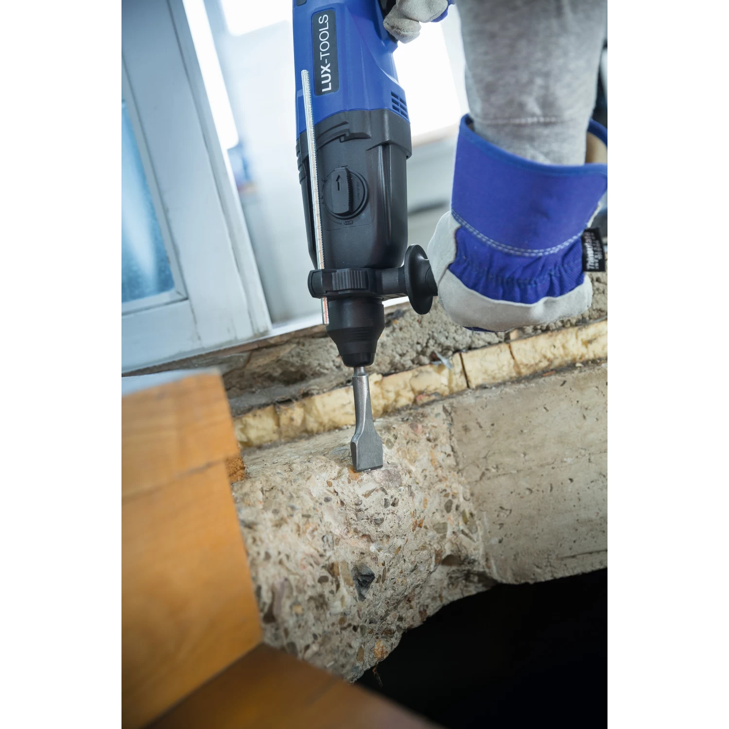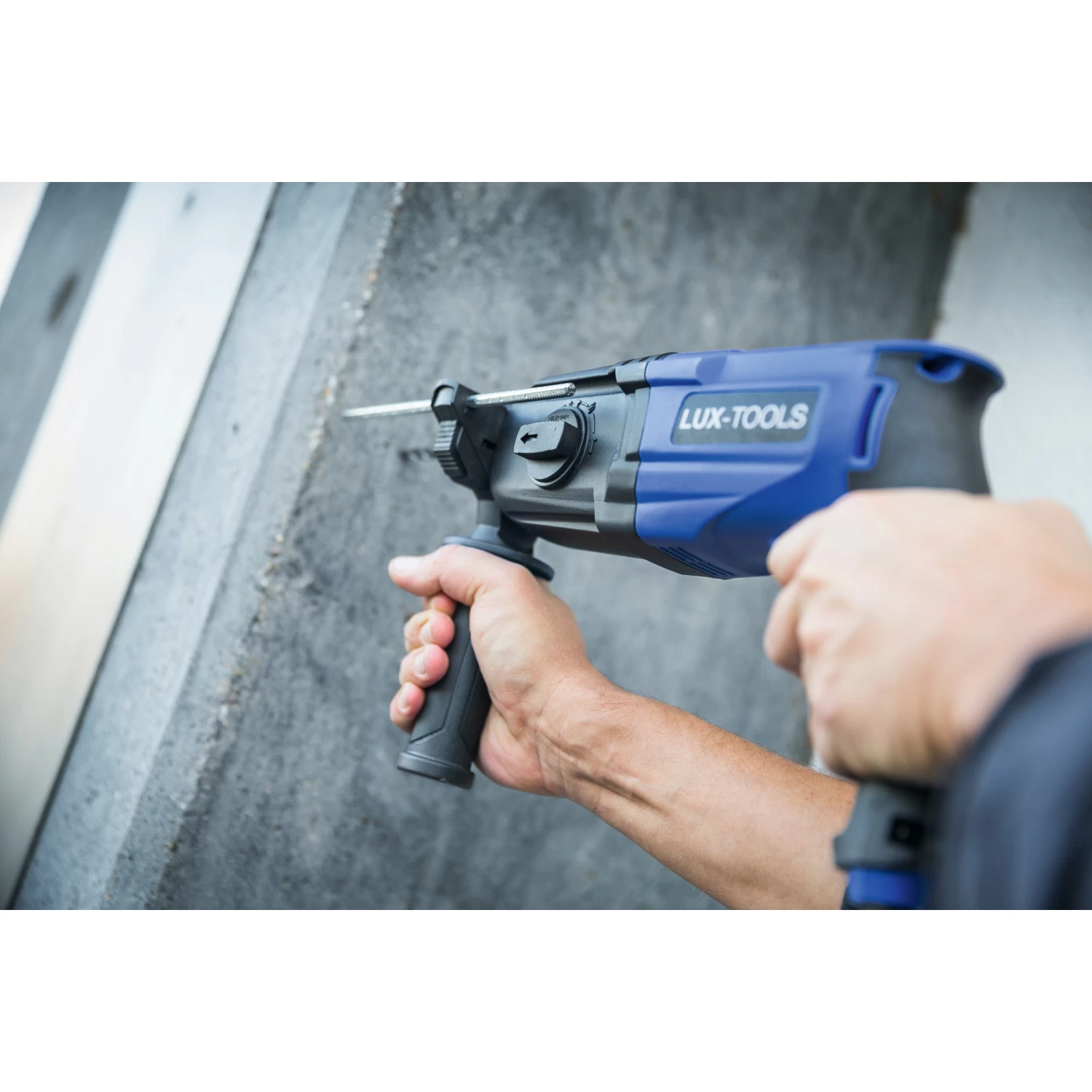 De LUX boorhamer 800W is een veelzijdige hamer dat zowel kan boren, hamerboren als beitelen. Met zijn sterke 800 watt vermogen boort hij eenvoudig in steen, beton en metselwerk. De boorhamer heeft een maximale boorcapaciteit van 26 millimeter in steen, 30 millimeter in hout en 13 millimeter in metaal. De boortjes zijn eenvoudig en snel te verwisselen in de SDS-plus boorkop. De rotatiestop met boorvergrendeling zorgt voor extra veilig werken.
