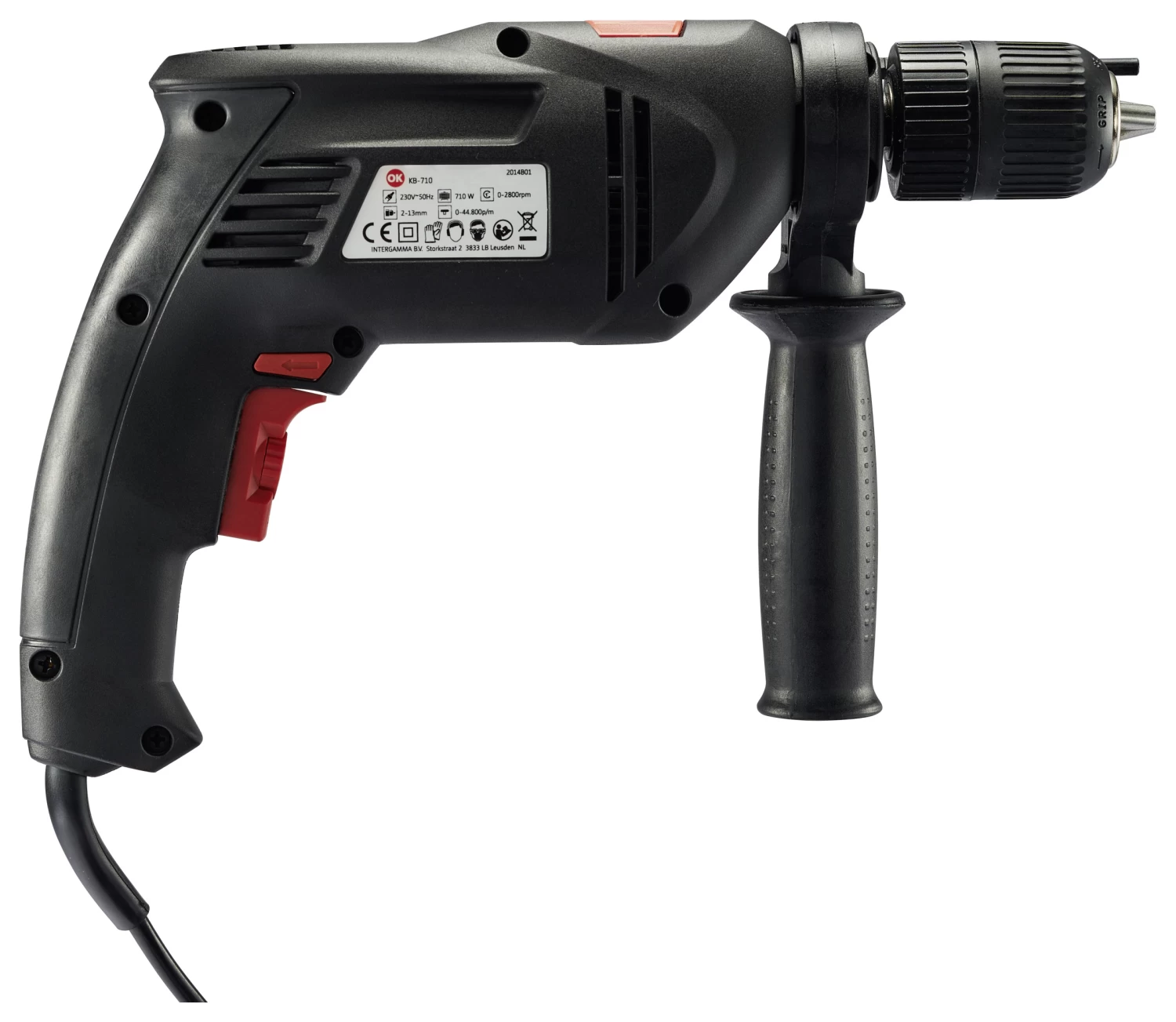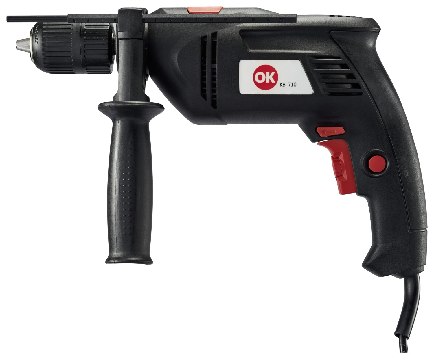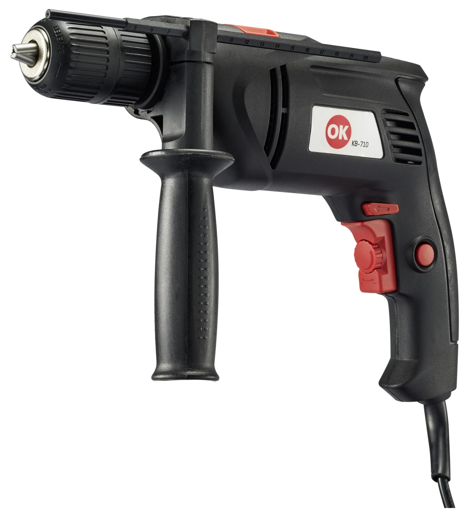 De OK klopboormachine KB-710 is een sterke boormachine voor klusjes in en om het huis. Met een maximaal vermogen van 710 watt en maximaal aantal toeren van 2800 per minuut boor je zonder problemen in het te boren materiaal. Het snoer van de OK klopboormachine KB-710 is twee meter.
