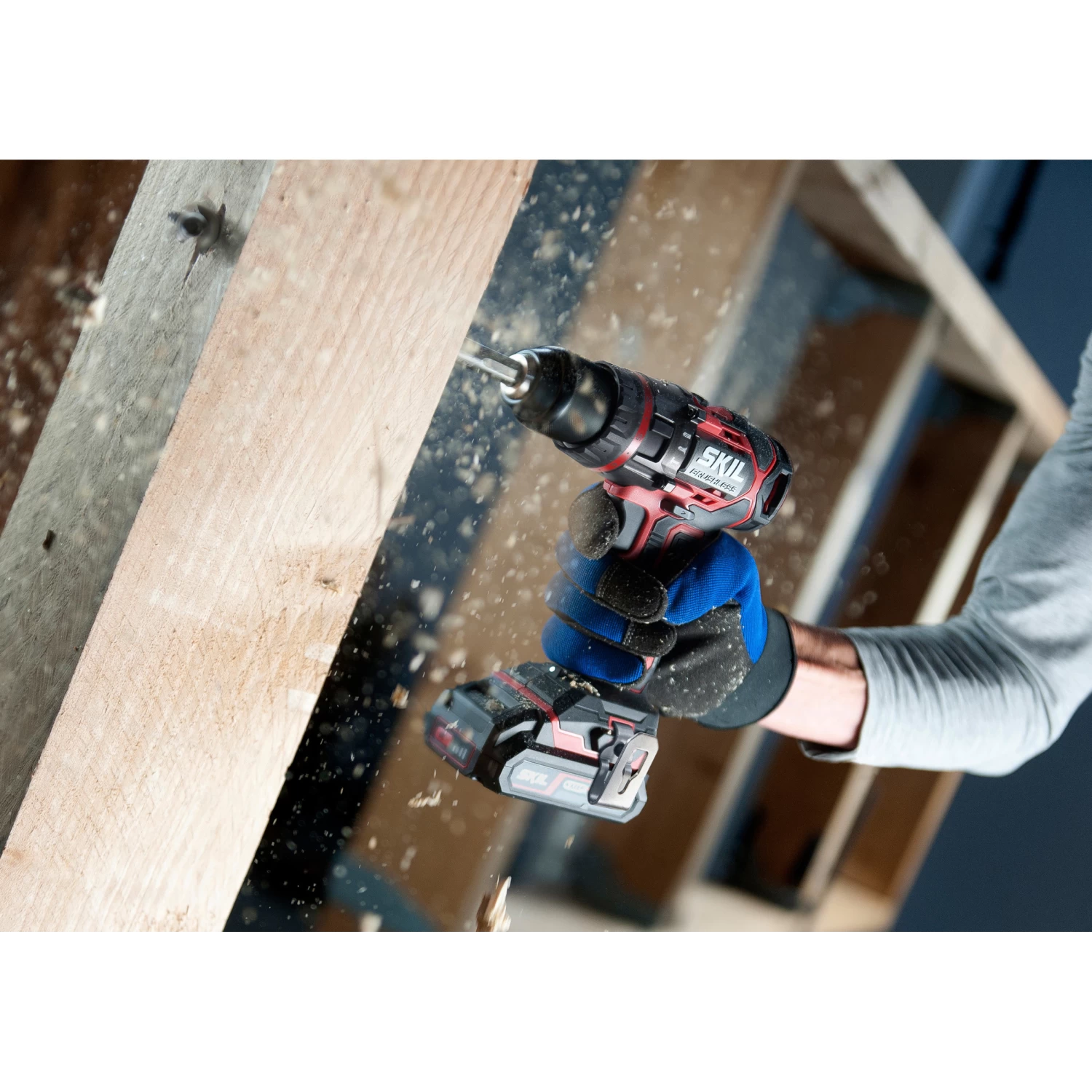 De 20V Max (18 V) SKIL 3070 is een borstelloze accu-klopboormachine met klopboorfunctie. Dit gereedschap is ideaal voor het boren in hout, metaal en zelfs metselwerk, en voor de zwaarste schroefklussen. De borstelloze motor is sneller, krachtiger en heeft een 10 x langere levensduur dan een vergelijkbare motor met borstels. De 17 koppelinstellingen garanderen nauwkeurige schroefresultaten. Dankzij de functieselector kunt u gemakkelijk schakelen tussen schroeven, boren en klopboren. Hij heeft twee snelheden, één voor snel boren en één voor zware boor- en schroefklussen. Dit gereedschap is voorzien van een metalen 13 mm-snelspanboorkop met enkele bus en vergrendeling die voorkomt dat de bits kunnen slippen. Dankzij de automatische asvergrendeling kunnen accessoires gemakkelijk worden gewisseld. Kortom, dit veelzijdige gereedschap biedt echt alles wat u nodig hebt: betrouwbare Lithium-Ion accutechnologie, variabele snelheid voor volledige controle en een LED-lamp voor goede zichtbaarheid van uw werk. De gepatenteerde accuniveau-indicator geeft het laadniveau van de accu weer. De SKIL 3070 HC wordt geleverd in een stevige draagkoffer, inclusief twee 20V Max (18V) 2,0Ah Keep Cool-accu’s, een snellader, een dubbelzijdig schroefbit en een ceintuurklem.