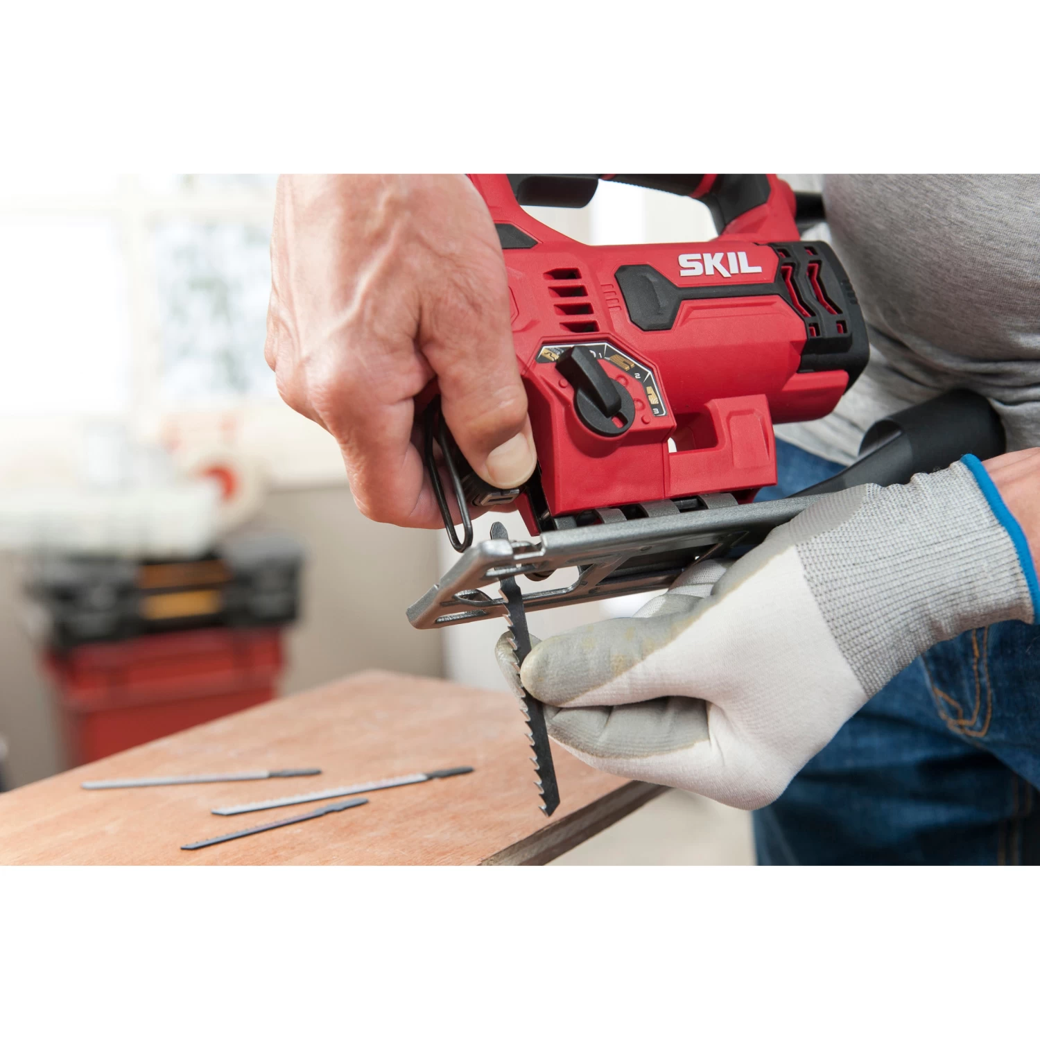 De 550W SKIL 4530 decoupeerzaag is uitermate veelzijdig. Hij is geschikt voor zowel gebogen als rechte zaagsneden in talrijke materialen.. Dankzij de materiaalselector met vier instellingen kunt u altijd de juiste instelling voor de klus vinden. Met de schakelaar met variabele-snelheidsfunctie kunt u de zaagsnelheid voor optimale resultaten regelen. Met het gereedschapsloze ‘Clic’-systeem kunnen zaagbladen eenvoudig gewisseld worden zonder dat u gereedschap nodig hebt. Andere handige kenmerken van dit gereedschap zijn o.a. de stofblazer die een duidelijk zicht op uw werkstuk geeft en de grote schakelaar met vergrendelknop voor continu gebruik. Met de verstelbare voetplaat kunnen verstekzaagsneden van 45° worden gemaakt. Voor een schonere werkomgeving past de stofzuigeradapter op de meeste gangbare stofzuigers. Bovendien zorgt het ergonomische ontwerp met softgrip voor extra gebruikscomfort. De SKIL 4530 GA wordt geleverd in een stevige draagkoffer, inclusief 7 zaagbladen en een stofzuigeradapter.