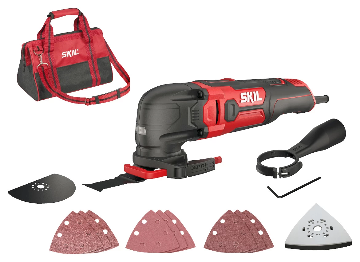 De SKIL 1491 is een krachtige 300W multitool met een variabele snelheid voor de beste resultaten in diverse materialen. Goede zichtbaarheid van uw werk wordt gewaarborgd door de LED-lamp. De meegeleverde diepteaanslag die verstelbaar is tot wel 60 mm, voorkomt snelle slijtage van accessoires en dat er per ongeluk materialen onder uw werkstuk worden beschadigd. Door de meegeleverde accessoires te wisselen, kunt u deze multitool gebruiken voor een groot aantal doe-het-zelf-klussen zoals schuren, zagen en snijden. De multitool is compatibel met ruim verkrijgbare ‘Starlock’ basis- en ‘OIS’-accessoires, zodat u altijd het juiste accessoire voor uw klus kunt vinden. Om tijdens het schuren schoner te werken, kunt u dit gereedschap aansluiten op de meegeleverde stofzuigeradapter die op de meeste gangbare stofzuigers past. Bovendien zorgt het ergonomische ontwerp met softgrip voor extra gebruikscomfort. De SKIL 1491 DB wordt geleverd met 9 vellen schuurpapier, een schuurzool, een diepteaanslag, een segmentzaagblad en een stofzuigeradapter.