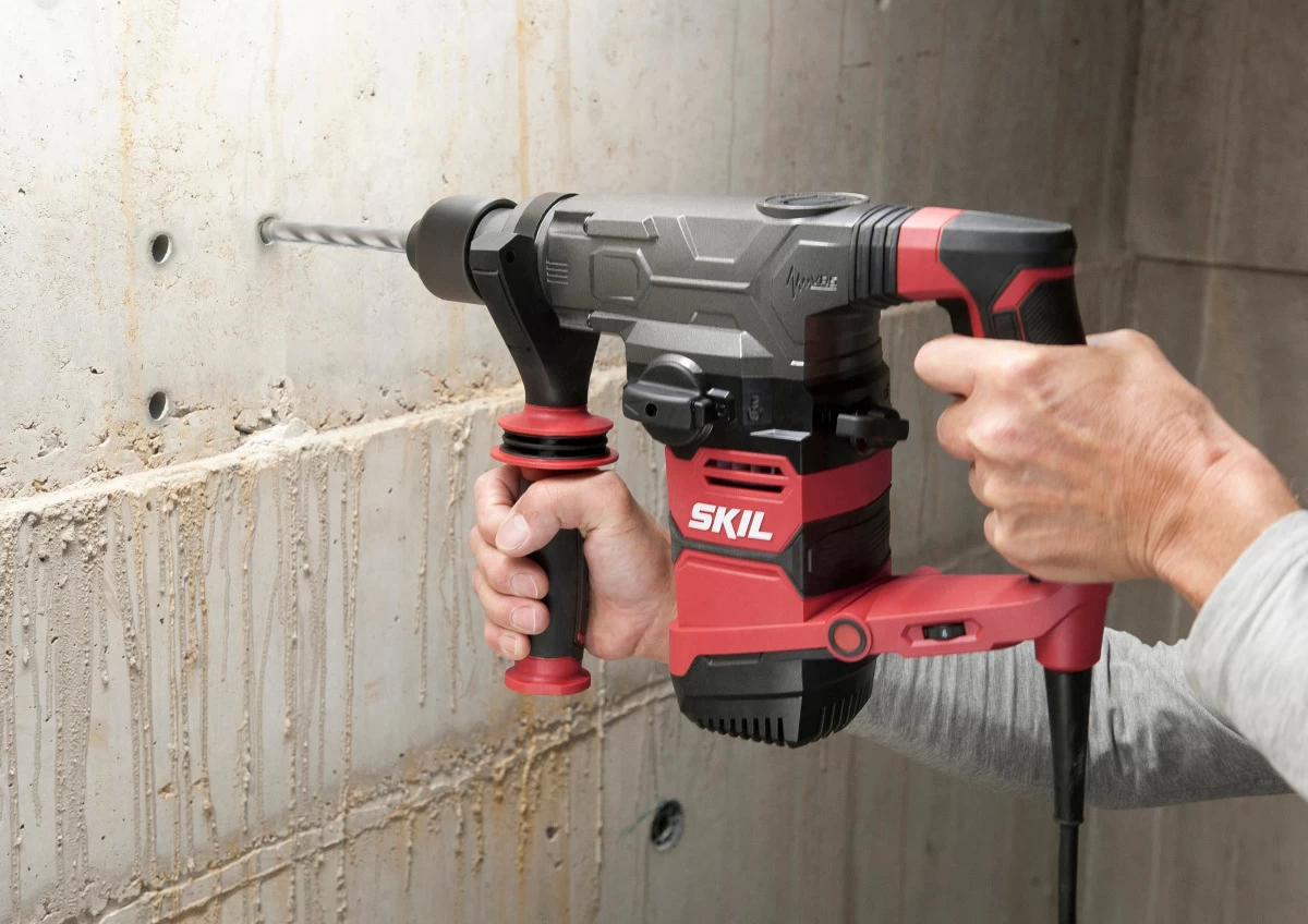 De pneumatische SKIL 1781 boorhamer met drie functies heeft een zeer krachtige 1500W motor en een vooraf instelbare snelheid voor optimale controle. Het gereedschap heeft een hamermechanisme voor boren in beton, een hamerstopfunctie voor normale boorklussen en een rotatiestopfunctie voor beitelklussen. Dankzij het trillingsreductiesysteem (‘VRS’), de comfortabele L-vorm en de robuuste magnesiumbehuizing is deze boorhamer bij uitstek geschikt voor zware klussen waarbij tot 36 mm in beton geboord of gebeiteld moet worden. Met het ‘SDS+’ systeem kunnen accessoires snel en eenvoudig worden gewisseld. De antislip softgrip en de verstelbare trillingsreducerende zijhandgreep maken een comfortabele bediening met twee handen mogelijk. Met de handige diepteaanslag kunt u de boordiepte voor blinde gaten instellen. De SKIL 1781 GB wordt geleverd in een stevige koffer, inclusief een set van drie ‘SDS+’ betonboren van 8, 10 en 12 mm, een puntbeitel, een vlakke beitel en een 13 mm-boorkop met ‘SDS+’ adapter.