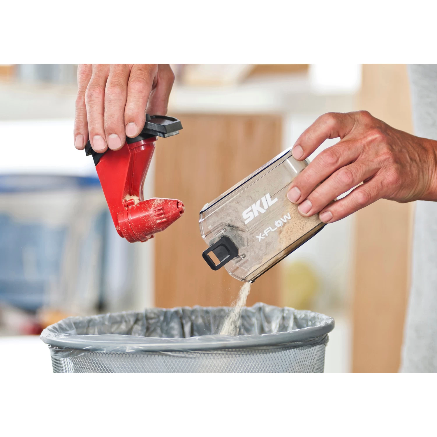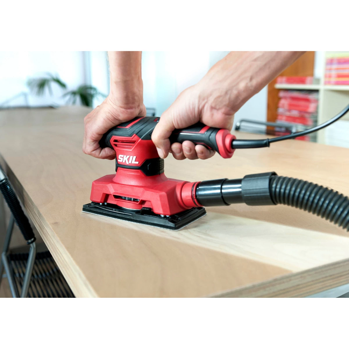 De SKIL 7362 vlakschuurmachine heeft een zeer krachtige 280W motor en biedt effectieve schuurbewegingen voor moeiteloos schuren van bijvoorbeeld deuren, tafels, omheiningen en schuurtjes. Met de variabele snelheidsfunctie van de schuurmachine kan de snelheid aan de klus worden aangepast. Dit gereedschap is voorzien van het unieke ‘X-Flow’-stofopvangsysteem dat stof van lucht scheidt zonder het gebruik van een filter. Het grootste voordeel hiervan is dat er geen filter verstopt kan raken, waardoor een constante krachtige stofafzuiging voor een langere en schonere werking gegarandeerd is. Maar als u liever een stofzuiger gebruikt, kunt u ook de stofzuigeradapter aansluiten. De hoogwaardige stofdichte kogellagers zorgen ervoor dat er geen stof bij kritische inwendige onderdelen komt, zodat de levensduur van het gereedschap wordt verlengd. Voor uw gemak is dit gereedschap uitgevoerd met een balanceersysteem door middel van contragewichten dat ‘VRS’ wordt genoemd. Het verlaagt de trillingsniveaus waardoor de schuurklus minder vermoeiend is. Deze schuurmachine heeft een dubbel bevestigingssysteem met klemmen en klithechting, zodat u zowel gewone vellen schuurpapier als schuurpapier met klithechting kunt gebruiken. De SKIL 7362 AA wordt geleverd met drie vellen schuurpapier, een ‘X-Flow’-stofcontainer, een stofzuigeradapter en een perforator.